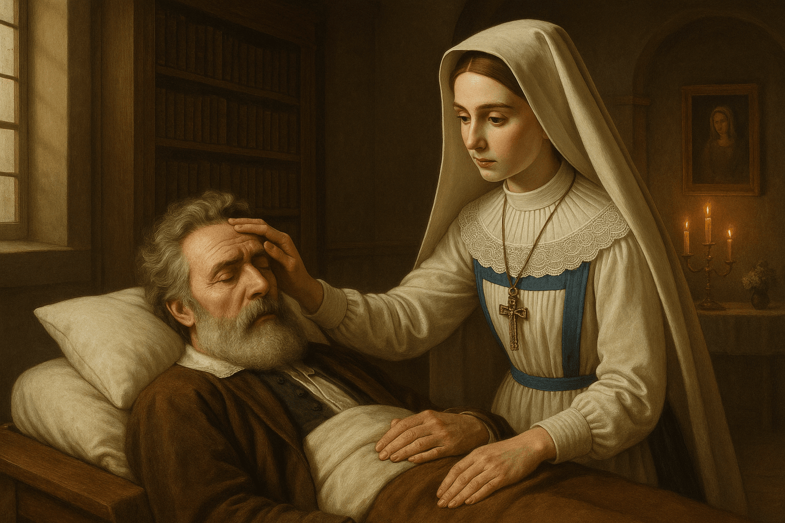 Ante la sorpresa de las legas y de la madre, un extraño ritual se desarrolló a aquella hora del día. De una carroza amplia estacionada junto a la calle, cuatro personajes forzudos se dispusieron a sacar de la misma una camilla en la que se hallaba tendido un hombre. Tras las oportunas indagaciones, los cuatro criados trasladaron a una sala especial a aquel visitante que daba la impresión de encontrarse muy enfermo y lo colocaron encima de una mesa incorporándolo levemente con un mecanismo que servía para tal fin.