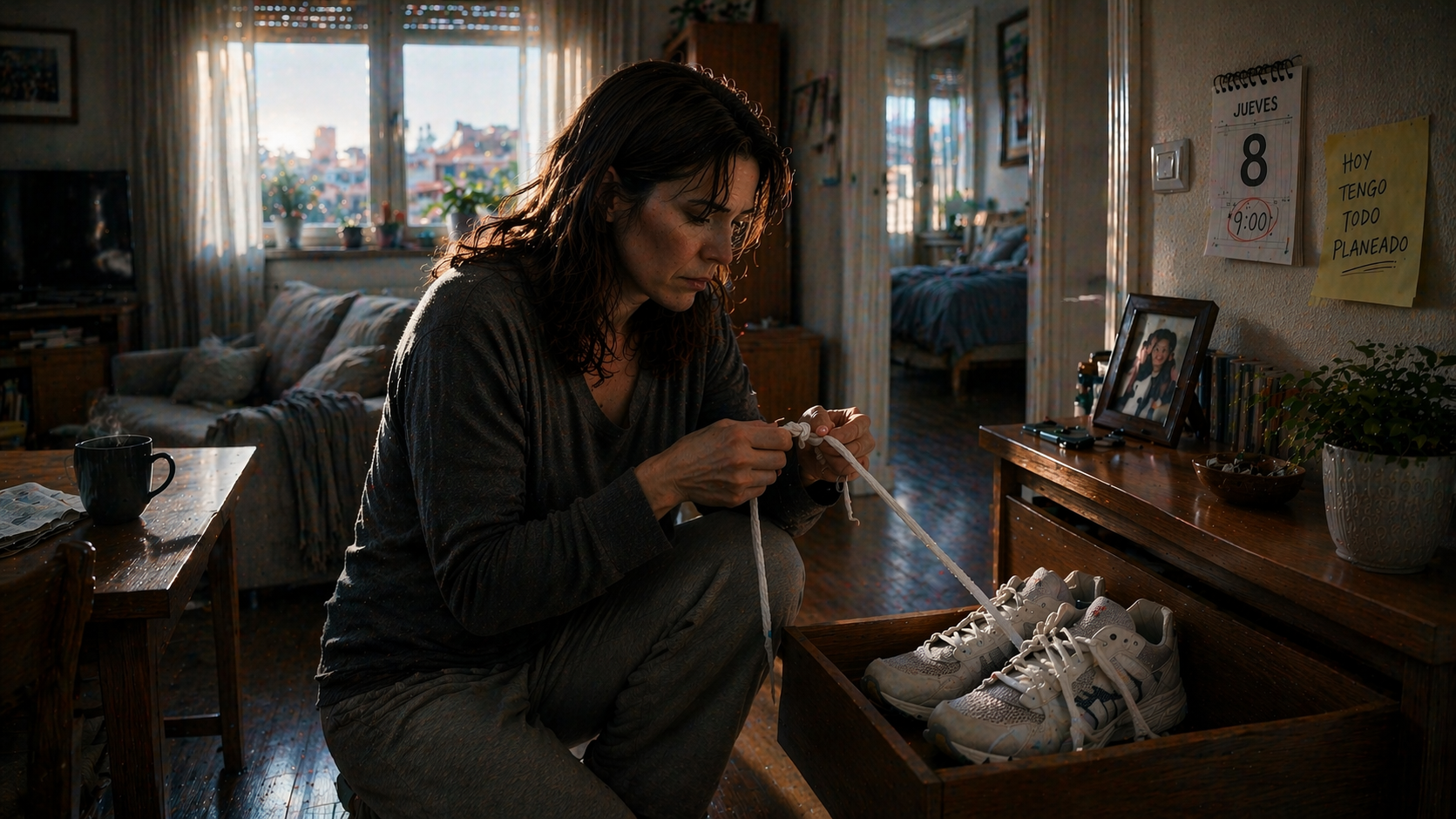 Se acercó a un pequeño mueble donde guardaba sus zapatos. Sus ojos se detuvieron en unas zapatillas deportivas. Se agachó despacio, como si cada gesto tuviera un peso específico. Con cuidado, extrajo los cordones. Eran largos, resistentes. Los sostuvo entre las manos unos segundos, evaluando su longitud, su textura… su utilidad.
